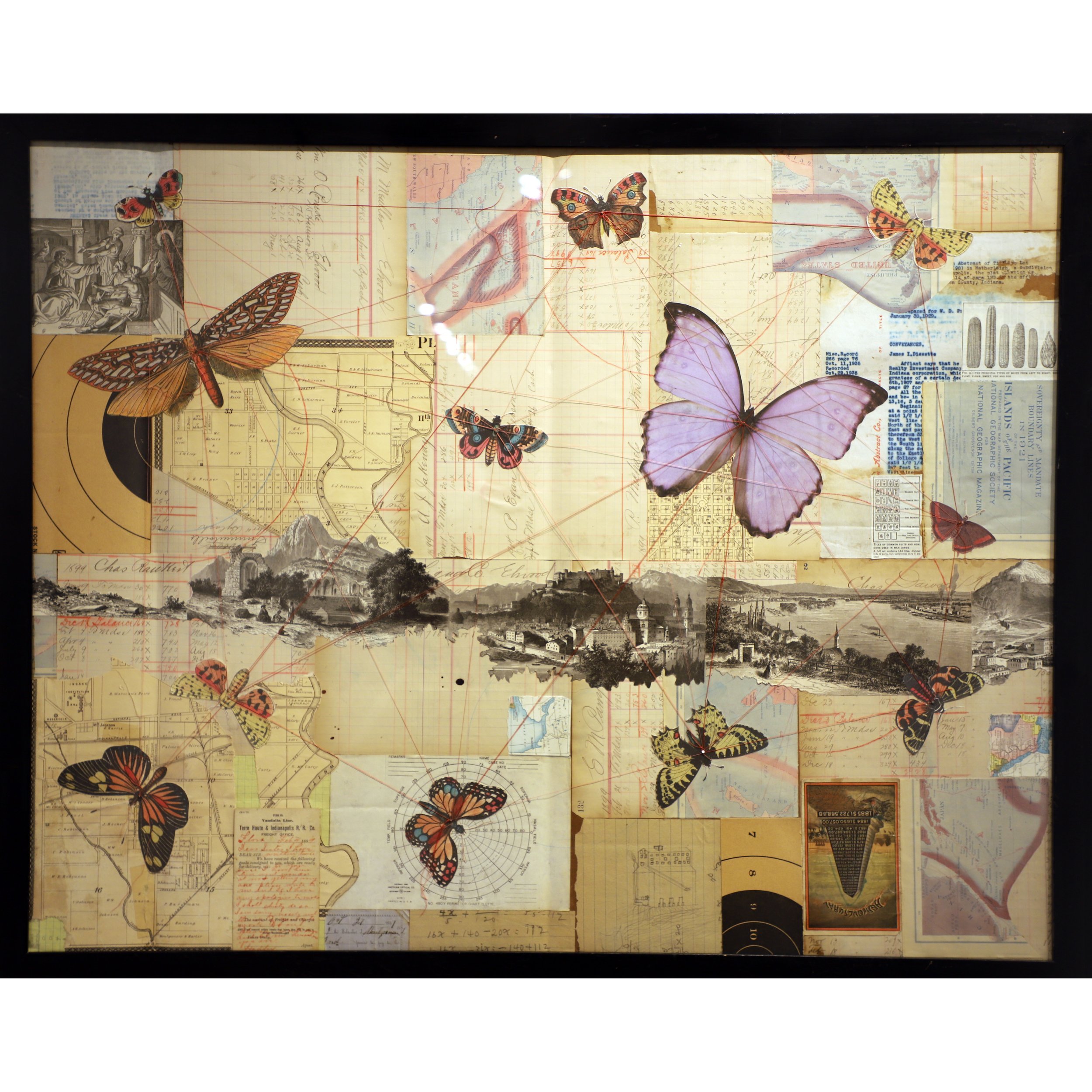 But viewers can decide for themselves when visiting FEVER DREAM, Kipp Normand’s show of new work in the Gallery Annex at the Harrison Center. The show includes two dozen new collages and half a dozen new shadow boxes, many on the themes that collectors have come to associate with Normand’s work: Americana, the supernatural, social non-conformity, and especially religion. Like most of Normand’s previous work, the pieces are a little dark, and very funny. Much of the work is small-scale, inviting the viewer to lean in, literally: Normand often builds in information that becomes visible only as the viewer steps closer to the piece, and spends more time and attention. The collage Recipes Against Melancholy looks like a patchwork of random vintage papers from a distance; close in, the viewer will notice a bright pink thread connecting words like pin-points on a map.