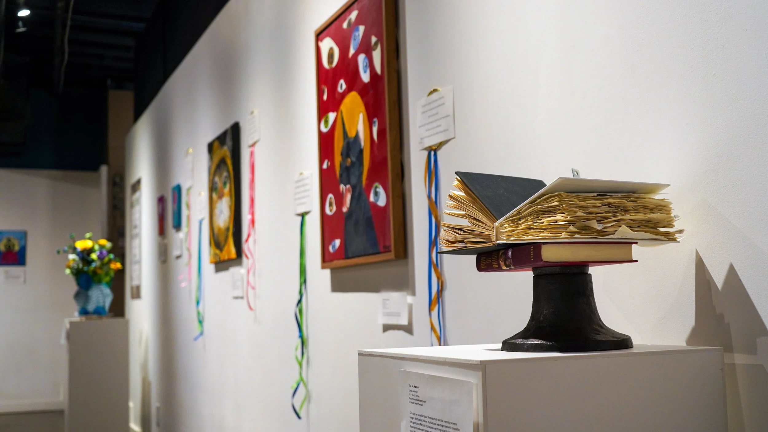 This exhibit has a variety of mediums, including mixed media, painting, and sculpture. Many of the works in this exhibit hold themes of transition, identity, hope, and loss as caregivers and patients process the formative experiences that arise throughout their treatment. These works of art commemorate the complexity of each individual and the journeys they are on and invite viewers to experience the power of creative expression. Many of the artworks include writing from the artists that allow viewers to have even more insight into the stories and inspiration behind the art.
