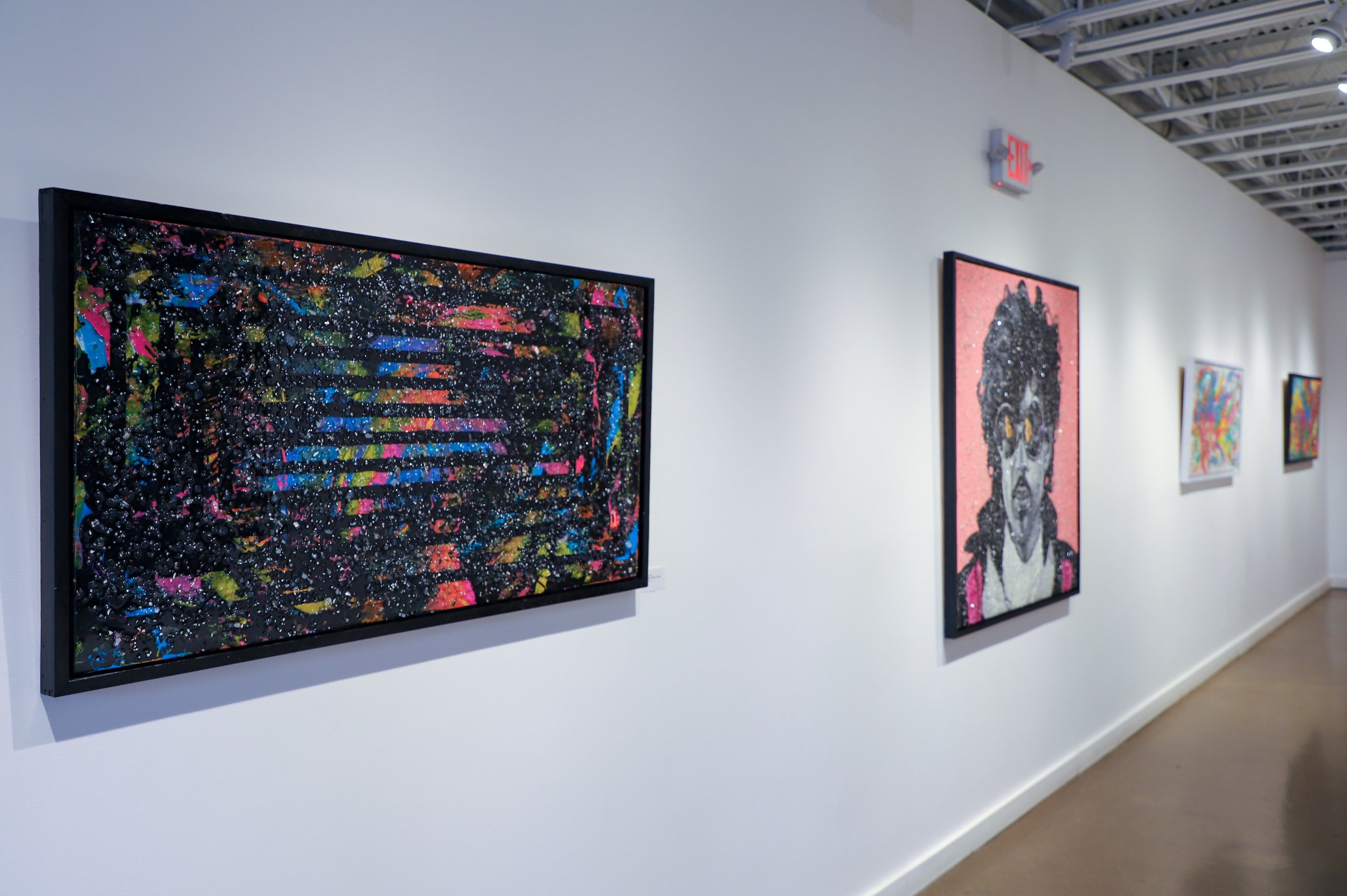 Hordge chooses iconic facial expressions for each portrait; each pop culture moment is easily recognizable. This work is about persona, as opposed to an intimate portrayal. Each creation is a character study venerated in resin. How do you view Biggie? What do you see in Marilyn? Every glittering surface reflects the audience's point of view. Hordge's work, both abstract and representational, invites the viewer to create their own experience and make their own meaning.
