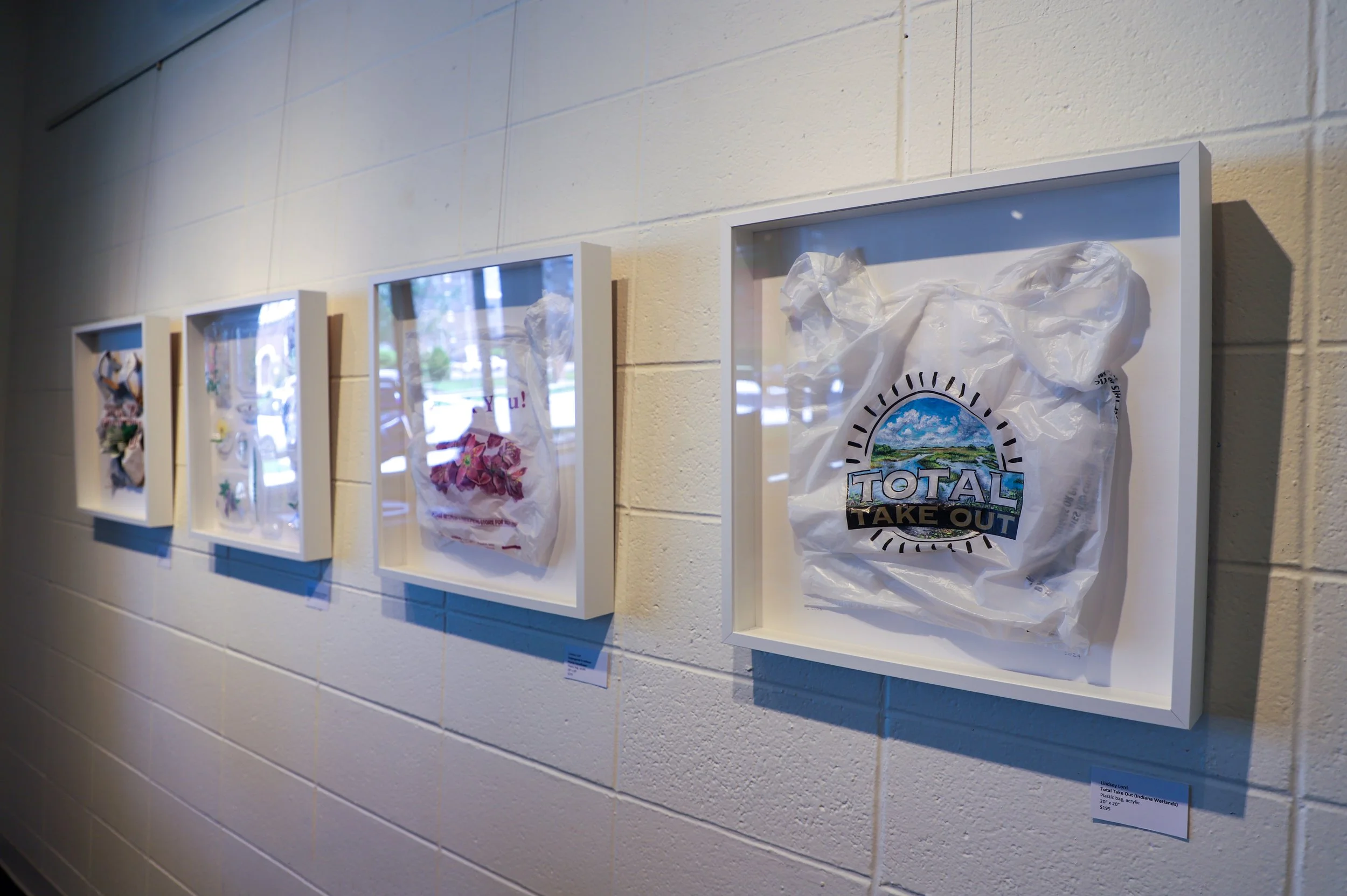 Making art is a way for Lord to process her fear for the state of our planet and feel a sense of hope. All of the materials in Take Out are pieces that Lord has collected in her daily life. Lord finds meaning and humor in the juxtaposition that many of her materials pose, such as plastic bags that say “thank you” and are covered in smiley faces. “We are being advertised to find happiness and then told that consumerism is how we find it, but we are creating a bigger problem.”