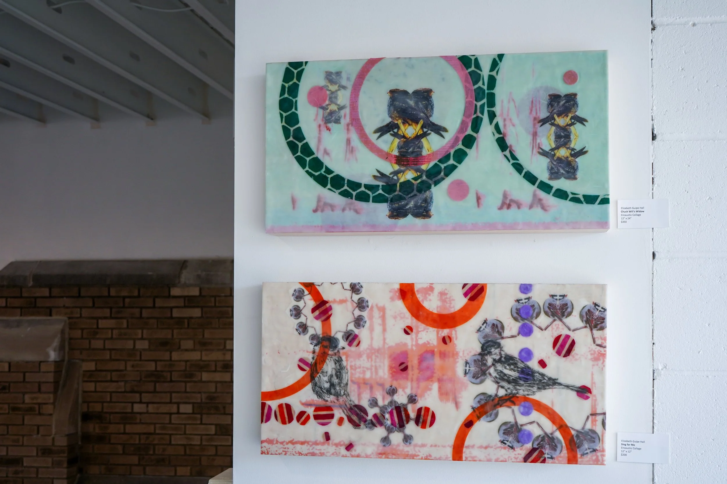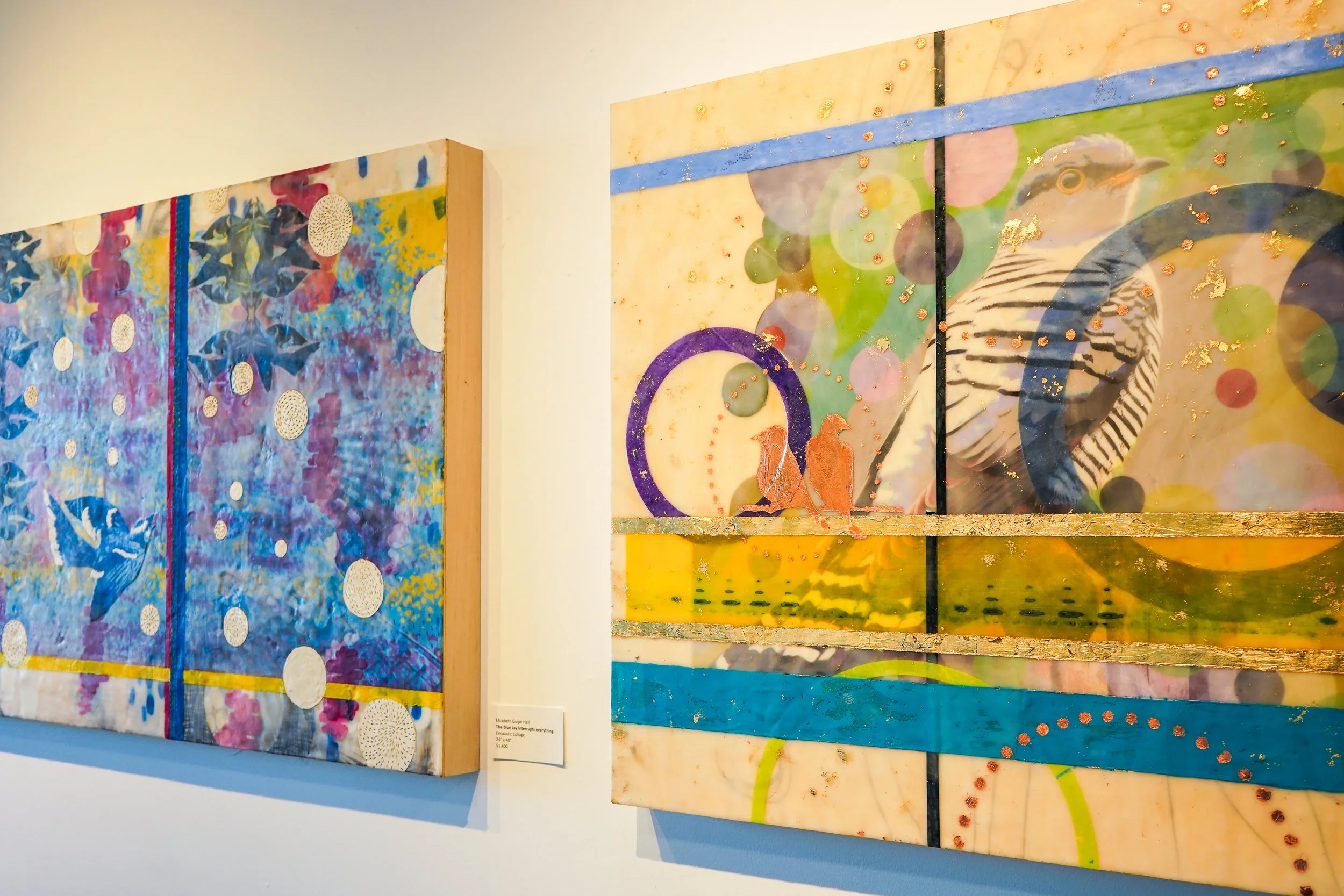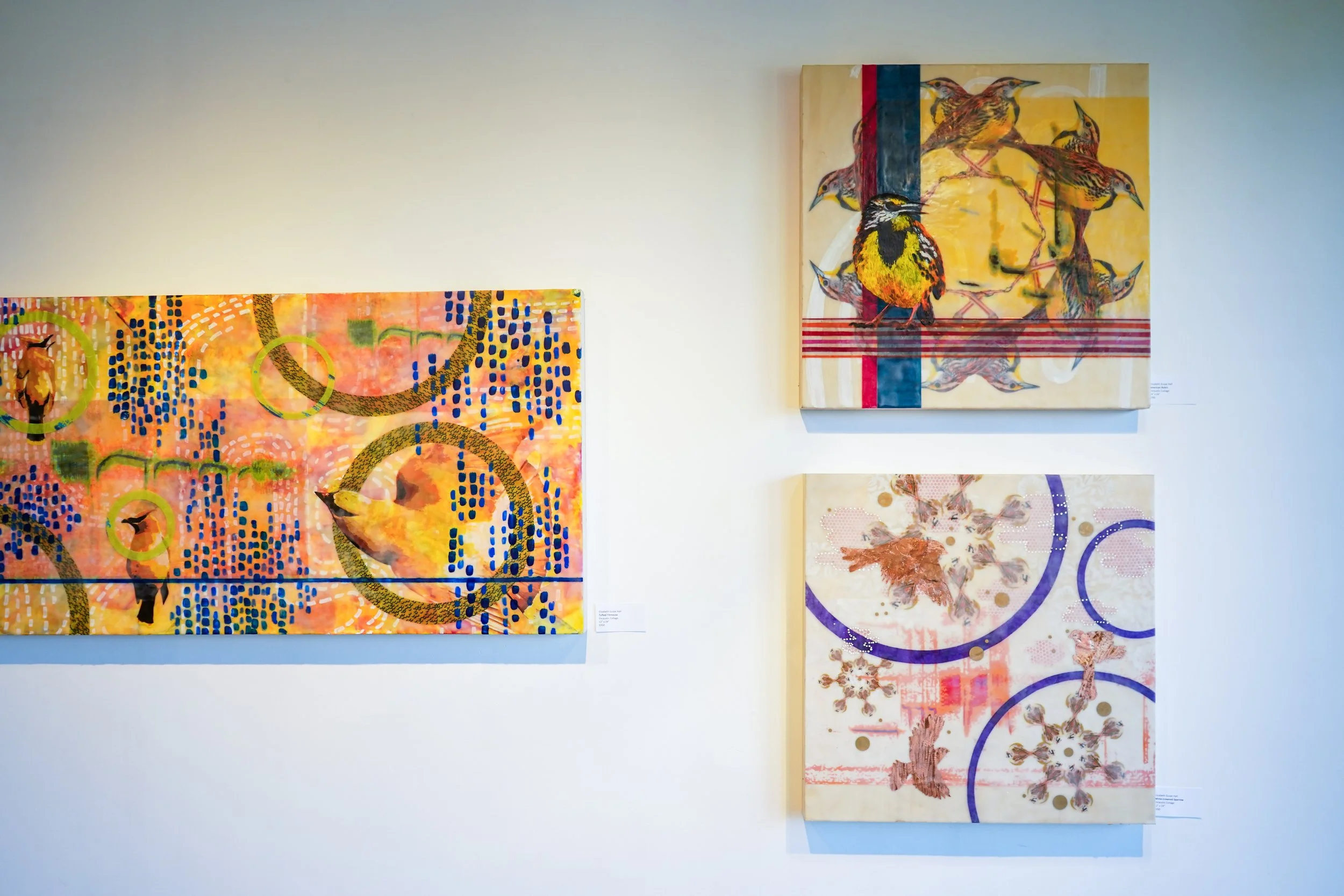 Beth Guipe Hall's exhibition Listen has found its home in the Sky Gallery at the Harrison Center, and the pairing couldn't be more apt. A show inspired by bird songs in a gallery named for the very realm where these feathered musicians make their music? It's hard to imagine a better match. The Indianapolis artist has filled this intimate space with encaustic works that translate the calls of cardinals, woodpeckers, and morning songbirds into something you can see and feel; layers of luminous wax and collage that capture not just sound, but the essence of listening itself.
