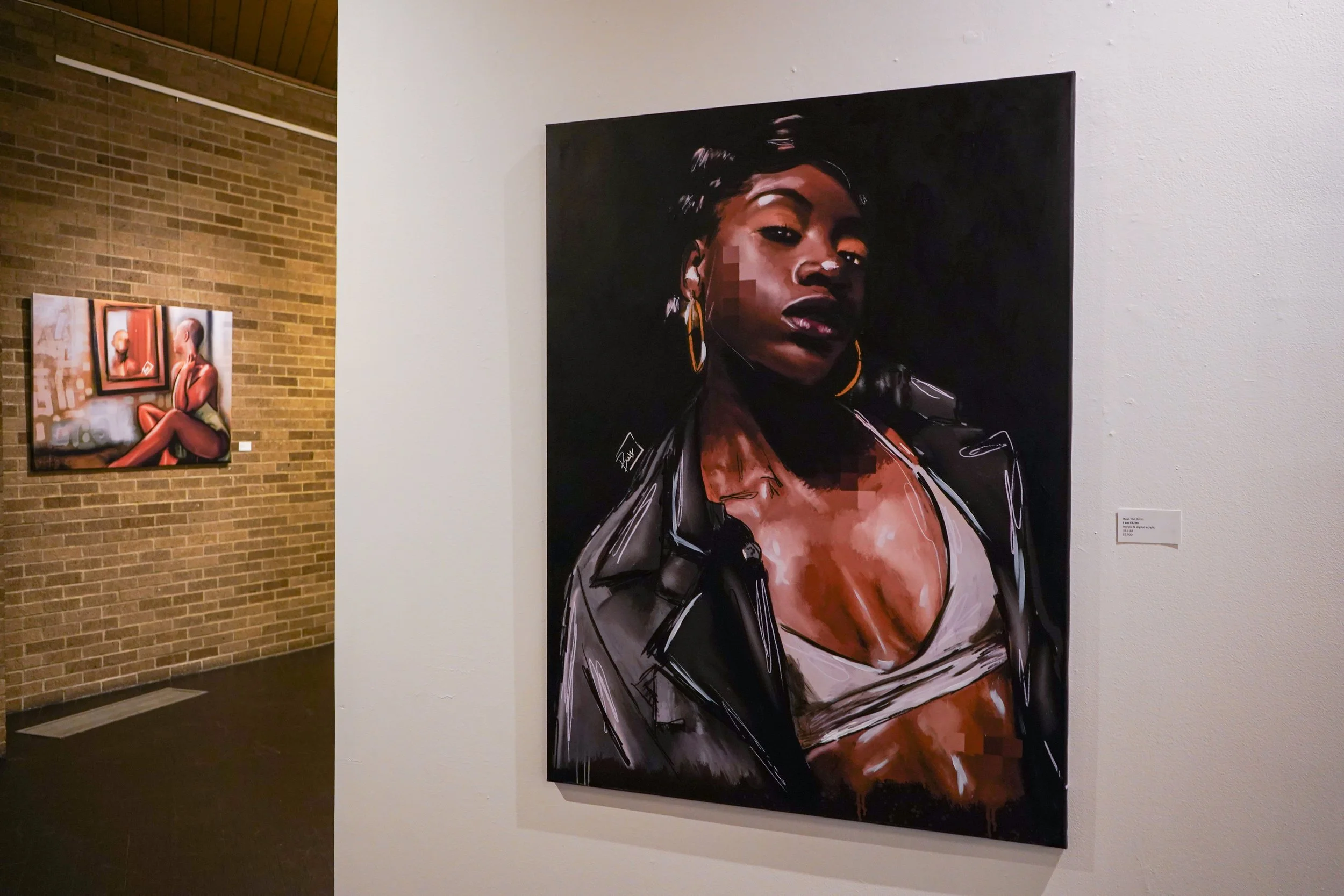 Her portraits are striking; some show faces with deliberately obscured eyes, subtle gestures, gazes that look past the viewer or pierce directly through. "Those small choices carry weight," she says. "They embody the tension of being seen and unseen, present and in-between, which is the heartbeat of this series." Each piece is paired with interviews -- the actual voices of these women woven into the exhibition through film, creating what Boxx calls "overlapping tones that never resolve completely, much like the stories behind these works."