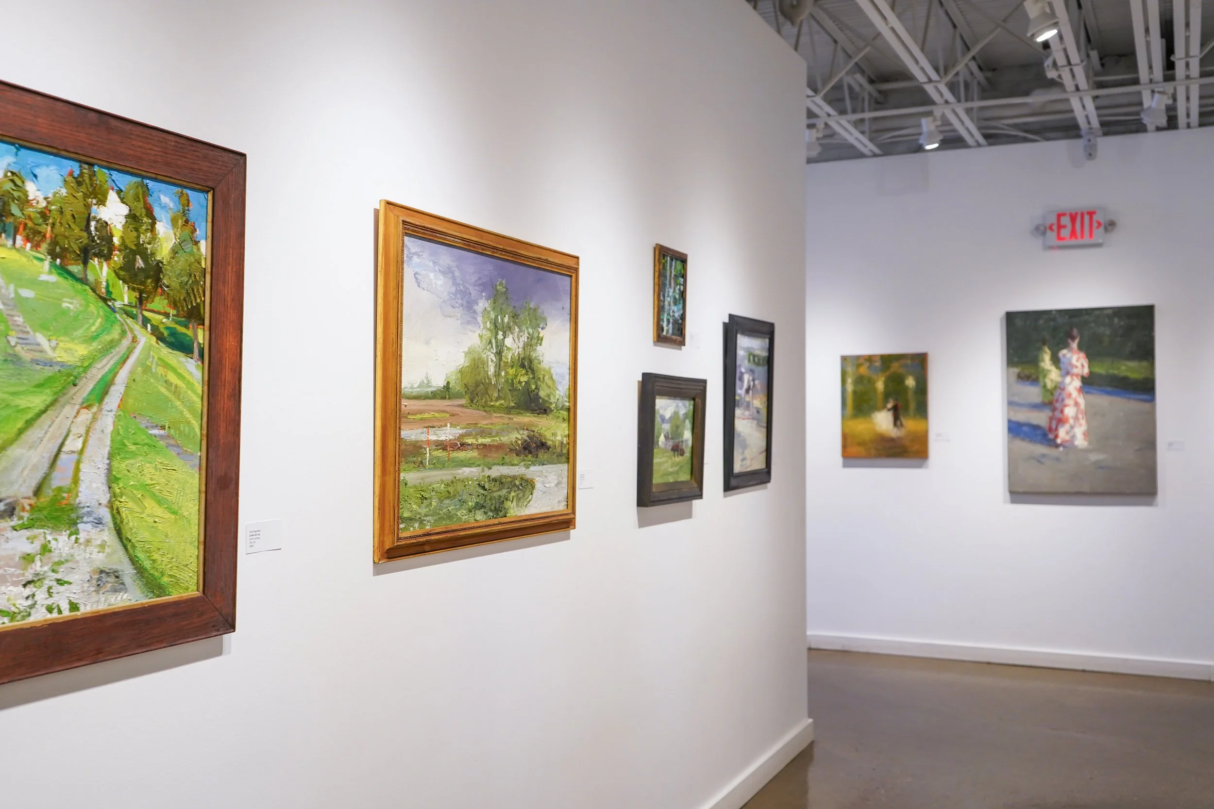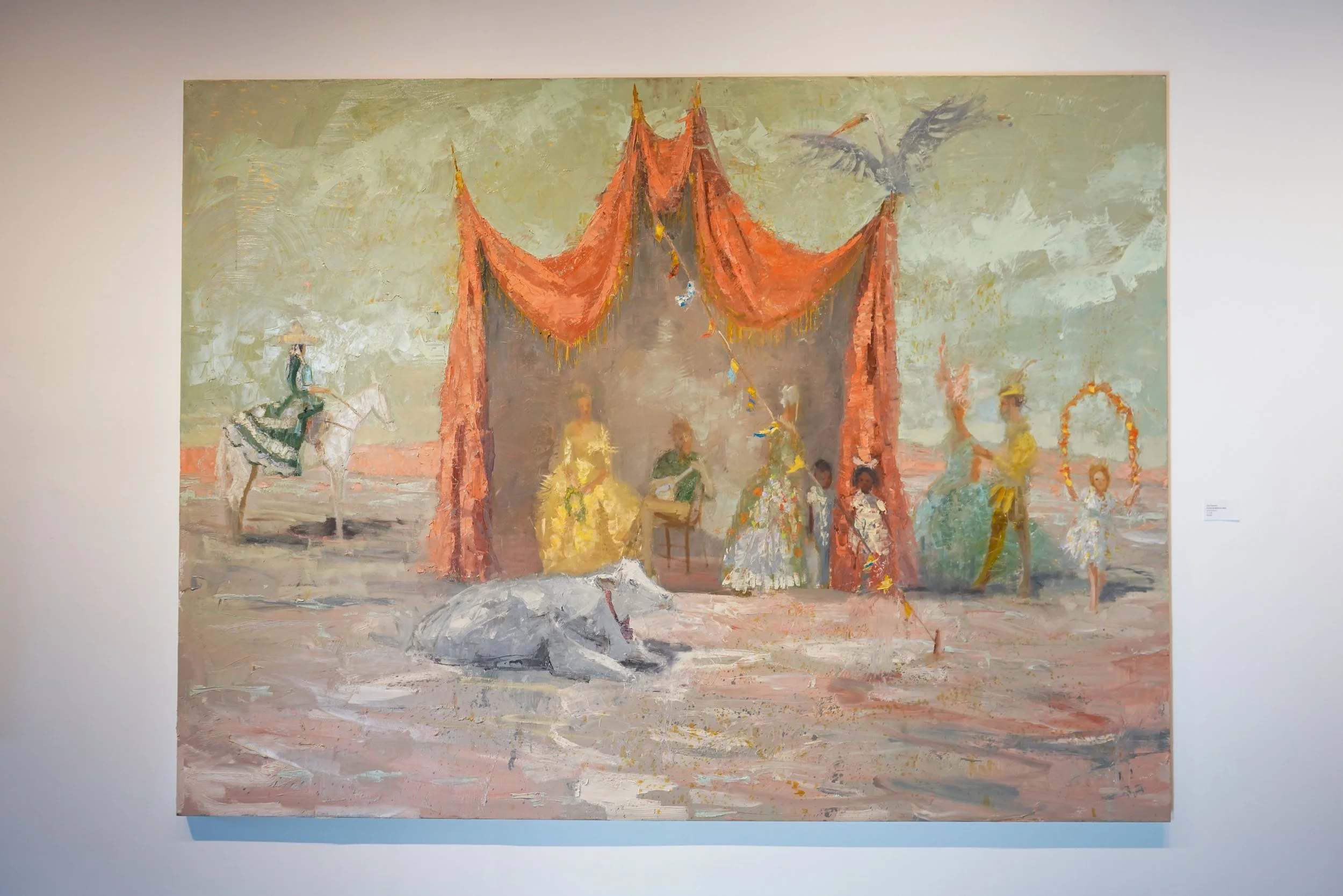 Ragsdale's process mirrors the unpredictability of the canopy itself. He begins each painting without predetermined plans, working quickly to classical music, “Fantasia on a Theme by Thomas Tallis” became the soundtrack for this body of work. "I build from listening to the work," he explains, "not telling it what to be." He paints fast, then destroys sections with trowels before rebuilding with palette knives; a build-and-edit sequence refined through a Tad Retz workshop on tone and light. The destruction is essential, he insists - without it, the paintings become too stiff, too controlled. The heavy impasto that results captures fabric billowing in wind, water catching afternoon light, figures half-emerged from shadow - layers of paint holding the history of their own creation.