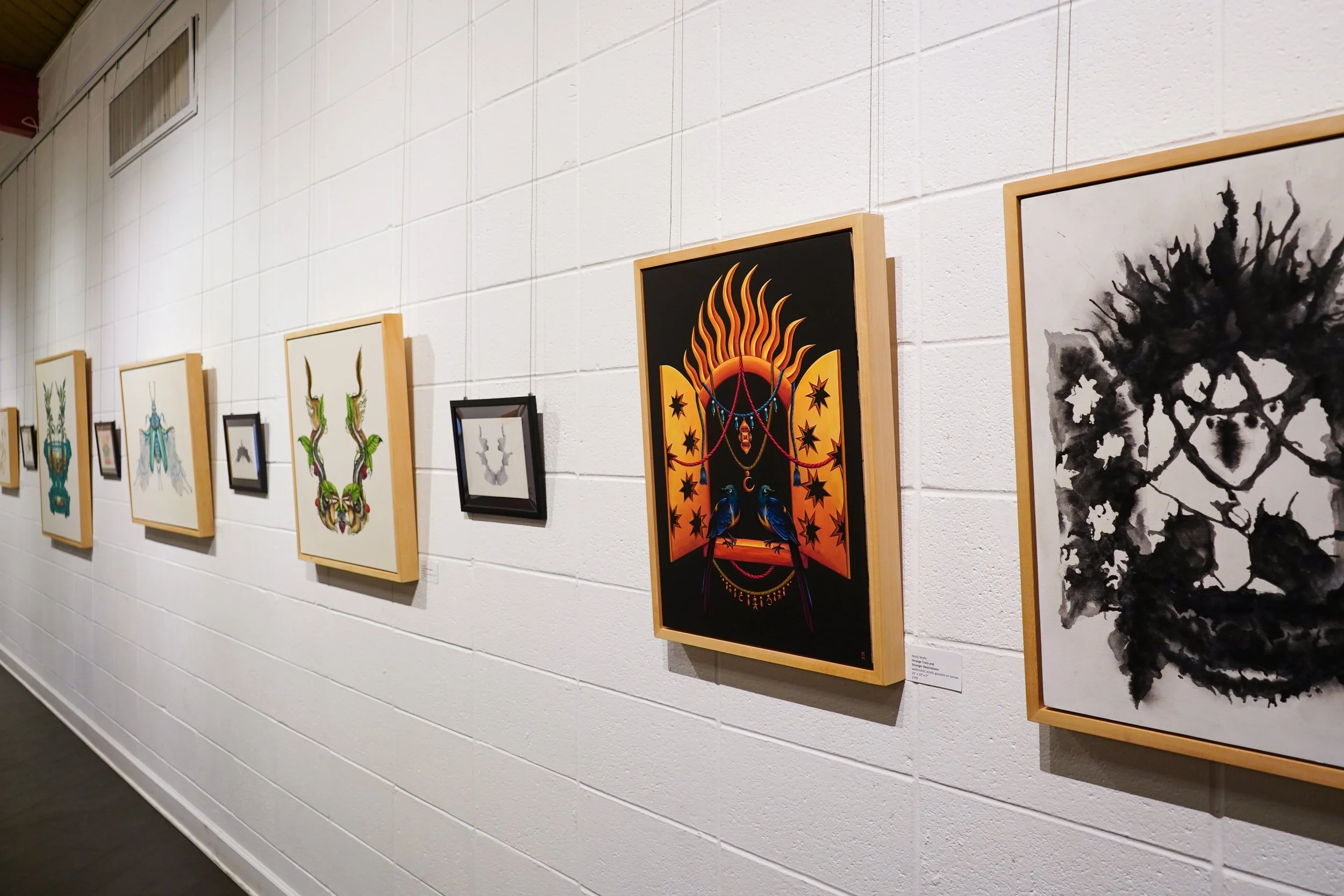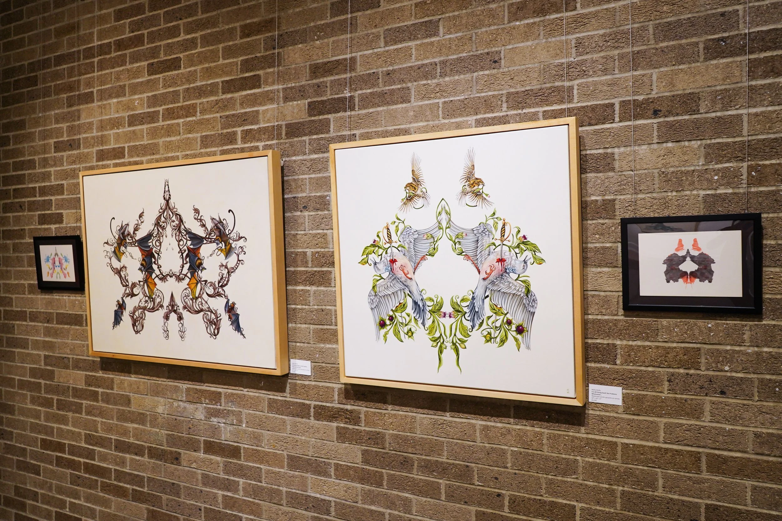 Beyond these central paintings, Wolfe flips the process on its head, creating new inkblots derived from her paintings. This inversion blurs the line between test and interpretation, inviting viewers to join her in the act of projection. Symmetry, pattern, and order dominate her compositions, yet each piece also carries a playful curiosity. Wolfe admits her process is meticulous, planned down to the smallest detail, yet she discovered that the most difficult works were the abstract inkblots she attempted herself. "Who would have thought painting blobs of ink would be so difficult?" she laughs, revealing how letting go of control became its own artistic challenge.