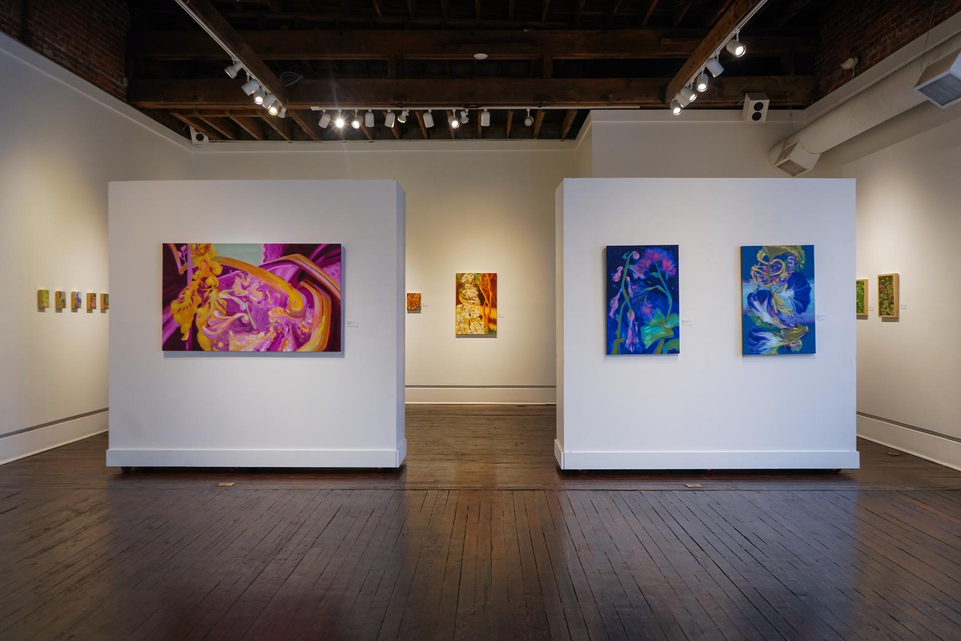 In her Harrison Gallery show, Elise Howell uses her brightly colored, anthropomorphized floral paintings to push back against the constant barrage of information. In an effort to point viewers back to nature and to be aware of their surroundings, Howell crafts mesmerizing compositions that animate the paintings.