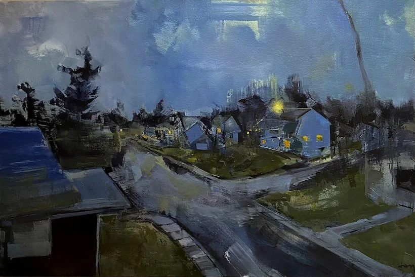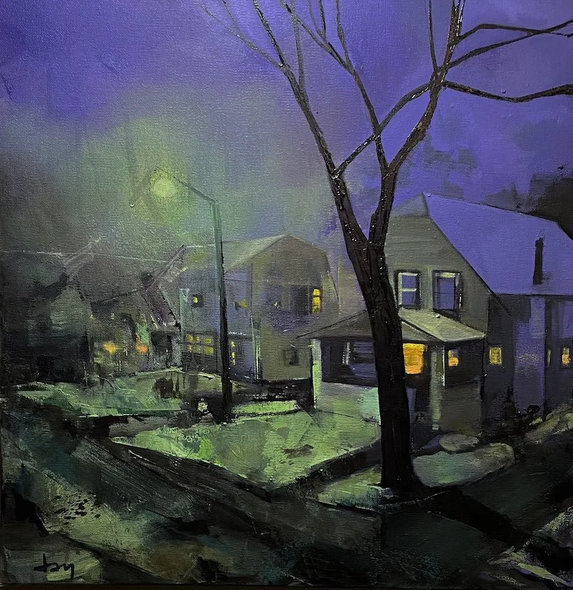 Paintings afford us a different way of seeing the world. Brendan Day knows this, as he depicts urban spaces not as they are, but how we may recall them in the fog of our own memory– like in the green light and violet sky of Late December Evening’s. The work bears the distant beauty of a long-forgotten childhood friend’s home.