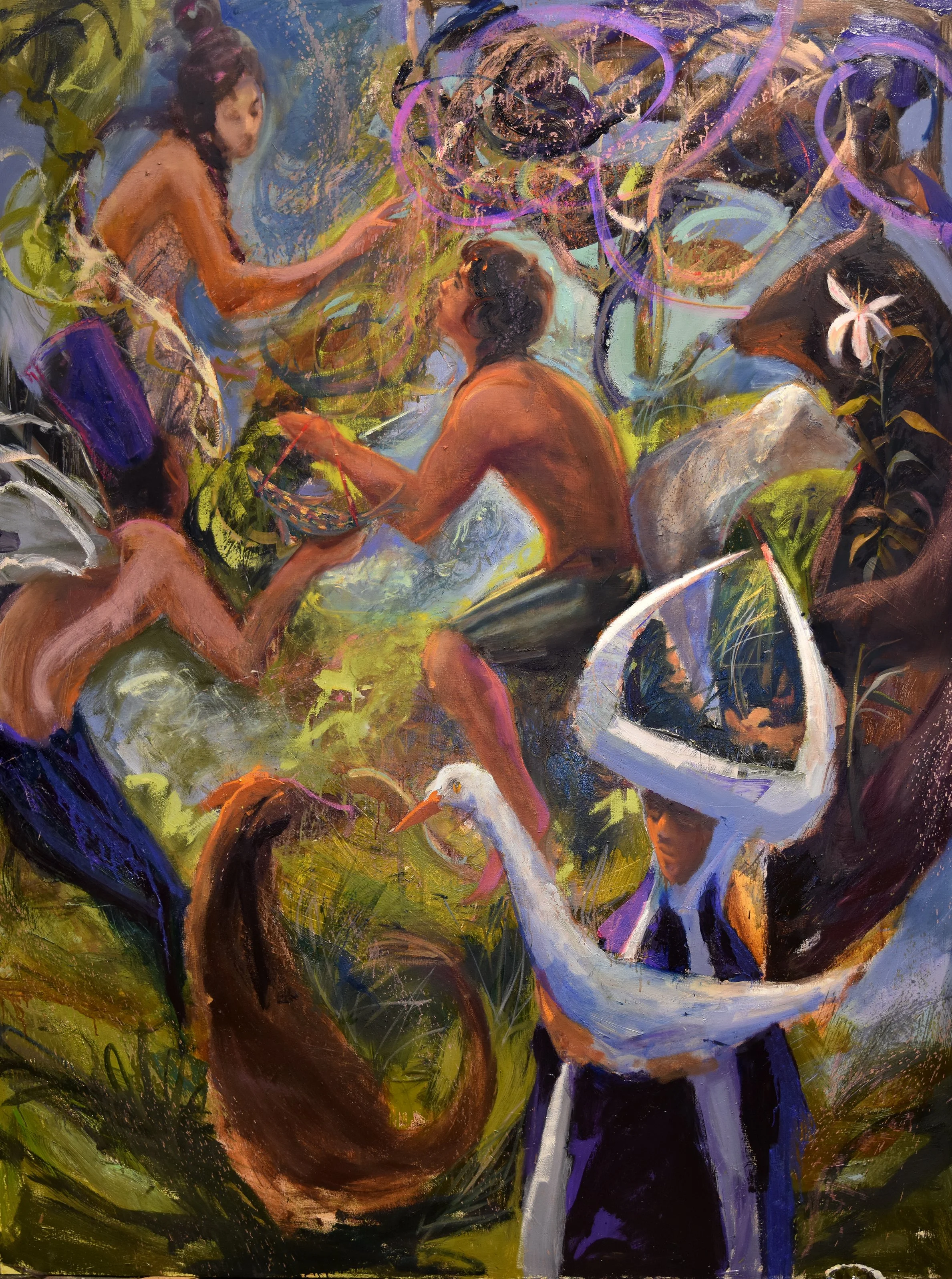 When I view Kyle’s work I see a recurring theme, celestial forest gatherings where sprite-like beings congregate among animal demi-gods to deliberate on the state of nature. I don’t know if that is his intent, but his figurative approach allows the viewer to create their own explanation. The figures suggest a narrative without demanding explanation while conveying a point of view centered in peace and candidness.