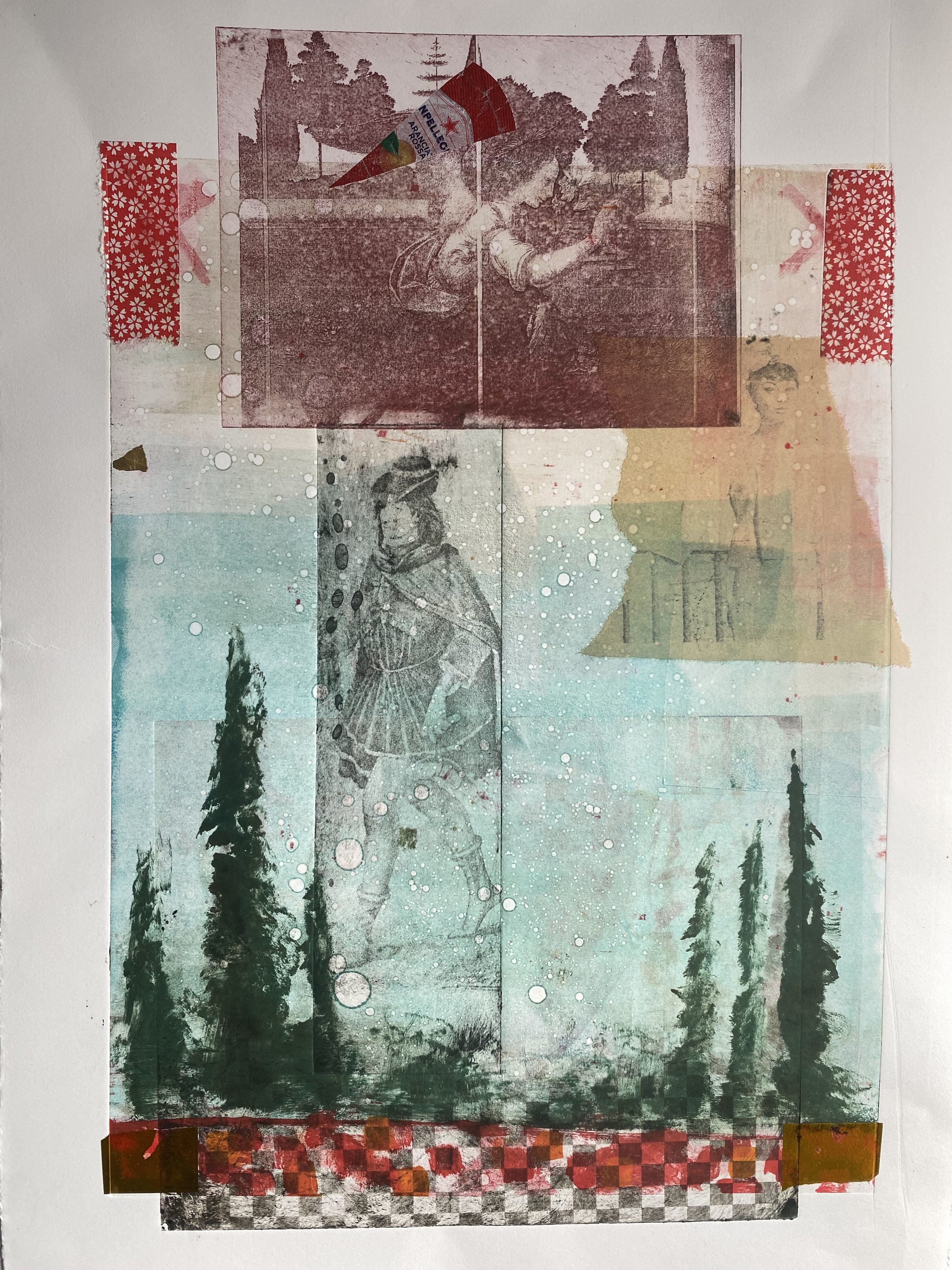 After attending a print workshop in Florence, this fish-toting figure was made into an etching plate and became the frontman of the subject matter in the series. The monotypes are rich with color, each element thoughtfully overprinted – allowing hazy swaths of pigment to envelop the background that borders each delicately etched figure. In more light-handed compositions, the characters emerge from the negative space like monochrome polaroid images, mingling with candy wrappers and scraps of exotic handmade paper, cleverly superimposed in strategic spots throughout the composition. These carefully curated bits of ephemera complement the overall color palette, adding more intrigue to the etchings.