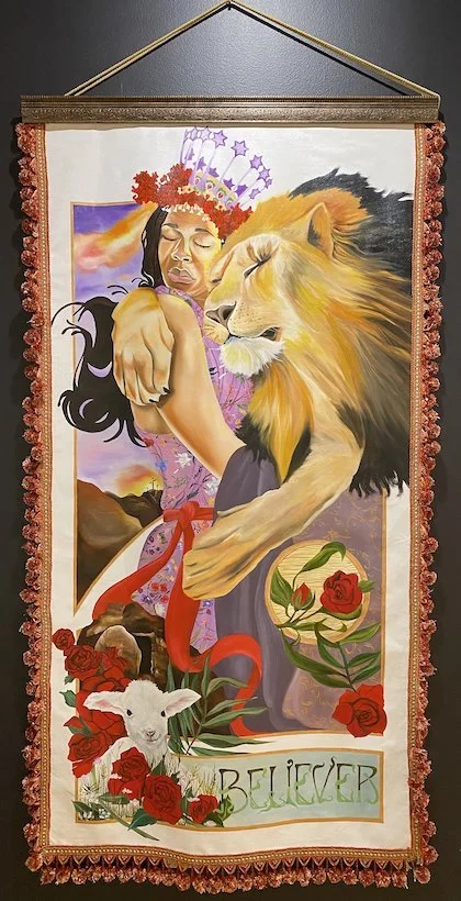 Each piece is bursting with a distinct personality; singular hairstyles, headbands, and glasses frame each face to create a unique persona. Themes of transformation, love, and individuality resonate from the works. Melanated skin emerges from tapestries while skulls, animals & florals mash together. Children laugh and stare unapologetically. Bees buzz sweetly around young brown women.