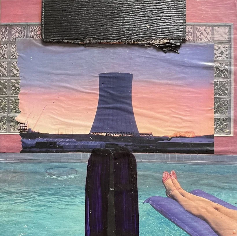 Violent imagery abounds in the show. A revolver threatens the viewer in Congratulations as a crowd celebrates. In This Is Why, a nuclear power looms over legs relaxing in a pool. Prodigal Son, shows a young man throwing a molotov cocktail. Figures are often visually separated or interrupted in his compositions adding to the feeling of doom and melancholy. Landscapes shift suddenly.