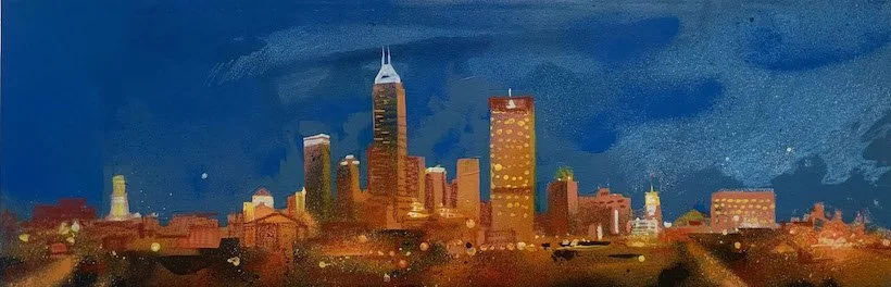 VIVID. COLORFUL. MOVEMENT. These are words that came to mind when I first experienced Known/Unknown, a show by Dan Handskillz in the Harrison Center’s City Gallery. Handskillz’s use of bright colors and shapes in pieces like Roughly From The North pulls us into a captivating tale about the city of Indianapolis. The clouds, the sunsets, and the downtown silhouette against the sky all leave me wanting to see more of the paintings and the city itself.