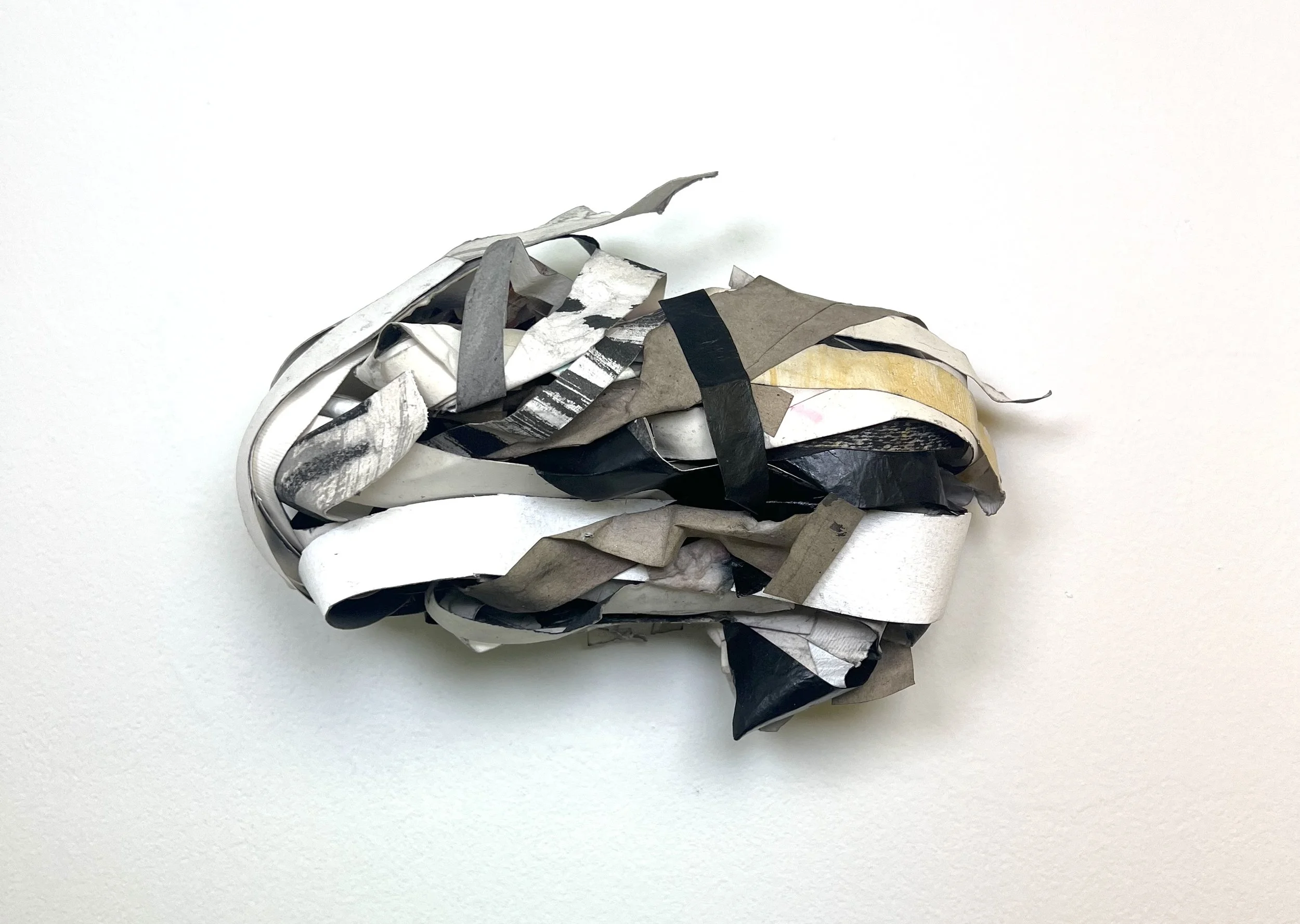 This assemblage creates a balance between hard and soft, painting and sculpture (and even drawing!). The beige and black also create an interesting contrast with the wall behind it, while the subdued white paper and other materials cause it to blend in a bit. We can tell that each of these materials has had a previous life, but we also don't know if this is their final stage; will they become something new in another piece Waddles will create someday?
