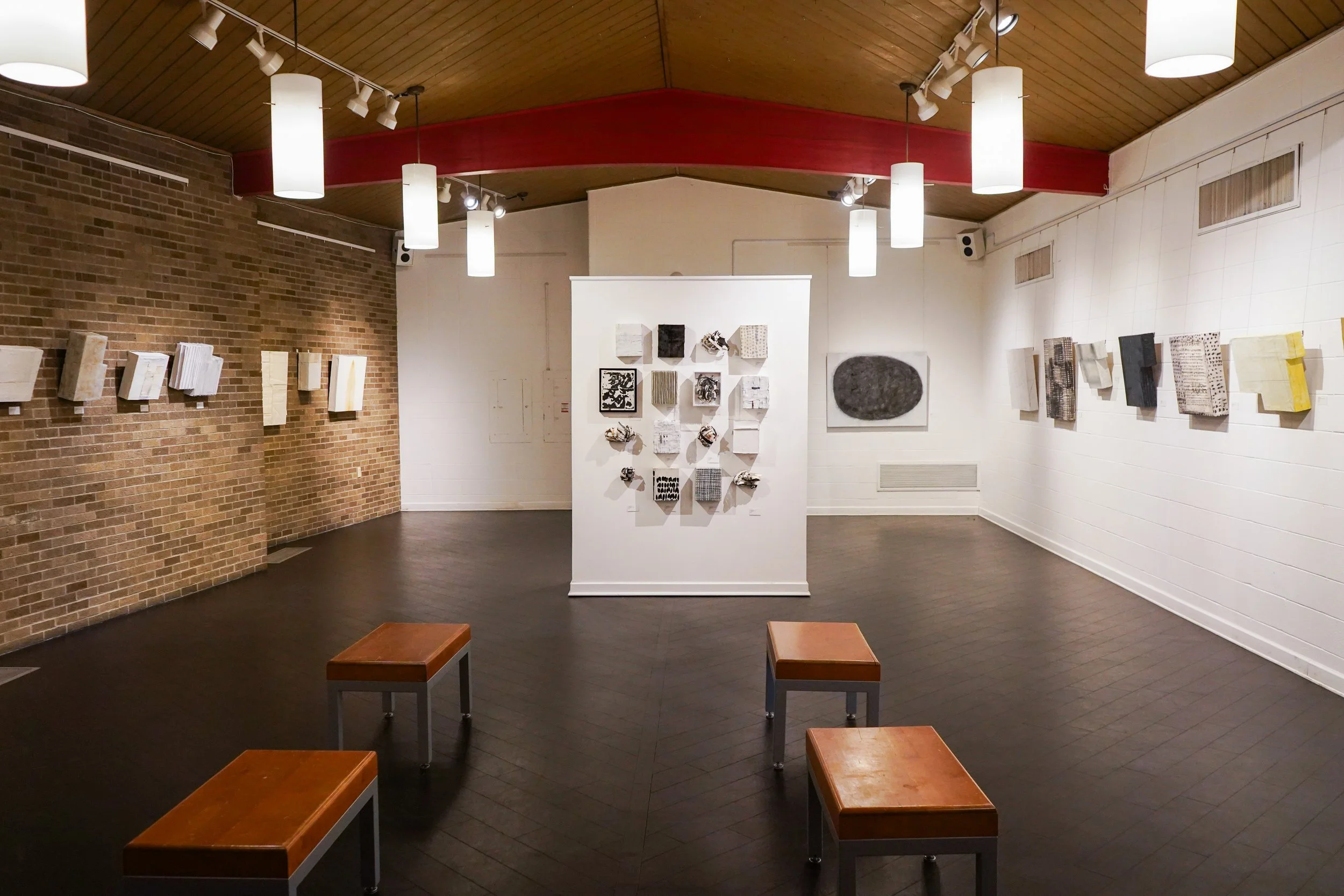 A perfect example of this in Waddles' show is her piece titled Line Memories III, which is one of her "organic form" pieces. While looking at this piece, it first appears hard and sculptural, partly due to its three-dimensional nature and muted color palette. However, a closer look shows that it is made of different materials, such as paper, tape, or even painted canvas.