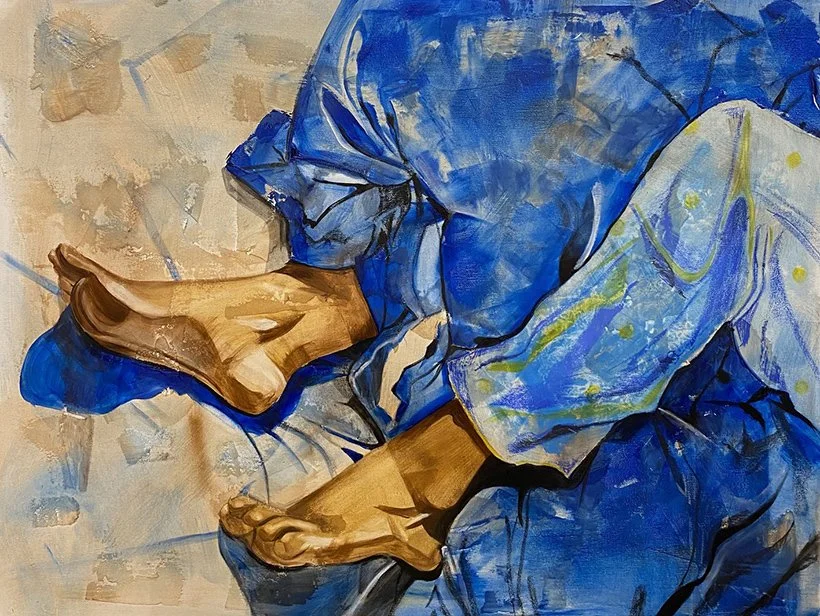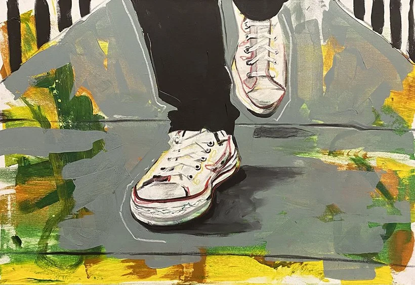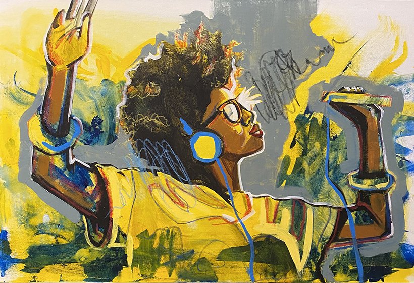 Through bold color, texture and composition, these pieces capture the beauty of seemingly mundane moments and objects. The focus of each painting is the delight itself; each act of joy is depicted in a more realistic style than the abstract background, representing something solid amidst the chaos. I played with different mediums to express different energies, depending on the painting’s theme.