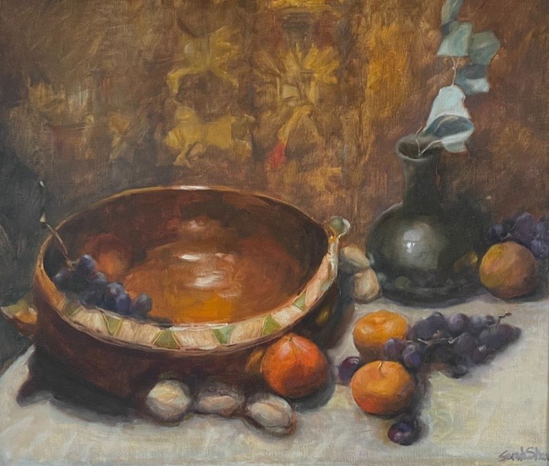 Shaw finds still lifes provide her with definition and control over shapes and values. She states, “the objects I’ve put on a tabletop are not as consequential as the total abstract (shape and value) effect of the painting.” Still lifes are often neutral, malleable, and offer room for experimentation. Shaw’s brushstrokes give additional meaning to these everyday objects. A sense of the aggregation of form, texture, light, and shadow inherent in still lifes arises in her work Southwestern Vibe.