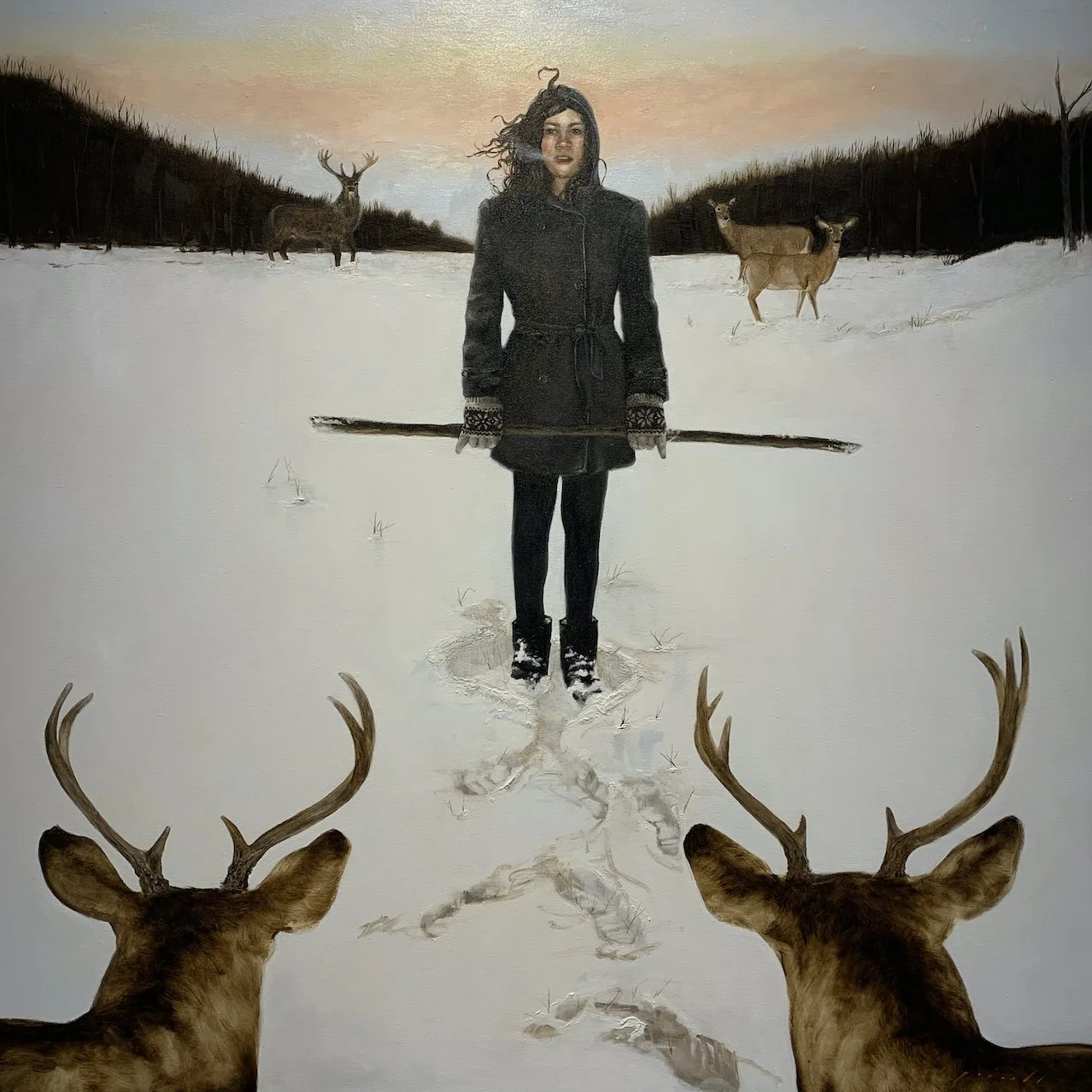 The subjects in this show are often seen in nature, having strange, perhaps supernatural encounters with the world around them. The scene depicted in The Deer’s Cry is inexplicable, as a woman stands surrounded by deer, their antlers framing her on either side symmetrically while she holds a stick in her hands. The scene reads like a cryptic ceremony as the viewer contemplates what will happen next. Is this a hunting trip? What is the reason for this encounter?