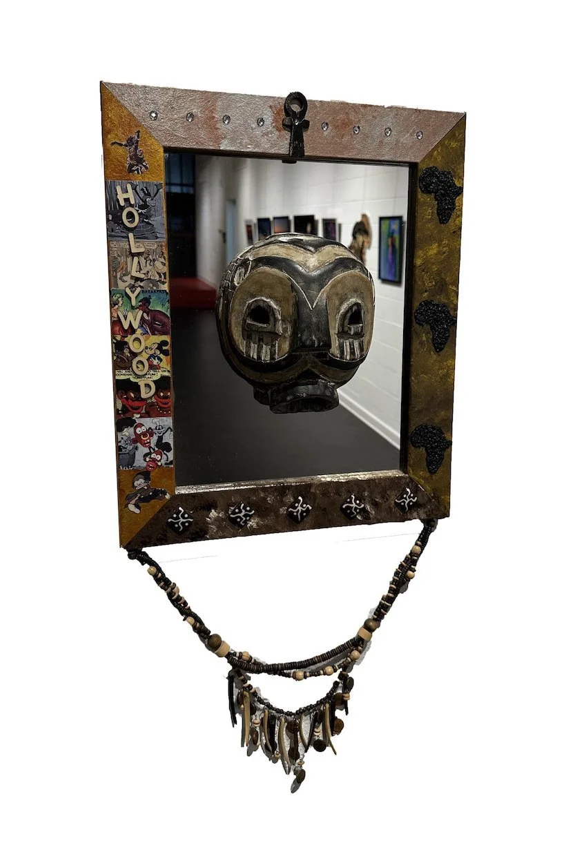 Like Armstrong’s cloaked piece, the show holds secrets left and right. Why are the chairs in Let’s Talk About It empty? In Mirror of Truth (Don’t Believe the Hype), a mask is centered in a mirror. When we stare at the piece, we see ourselves reflected, but with a tribal mask placed on our faces. The show often cloaks itself and, in return, cloaks the viewer as well.