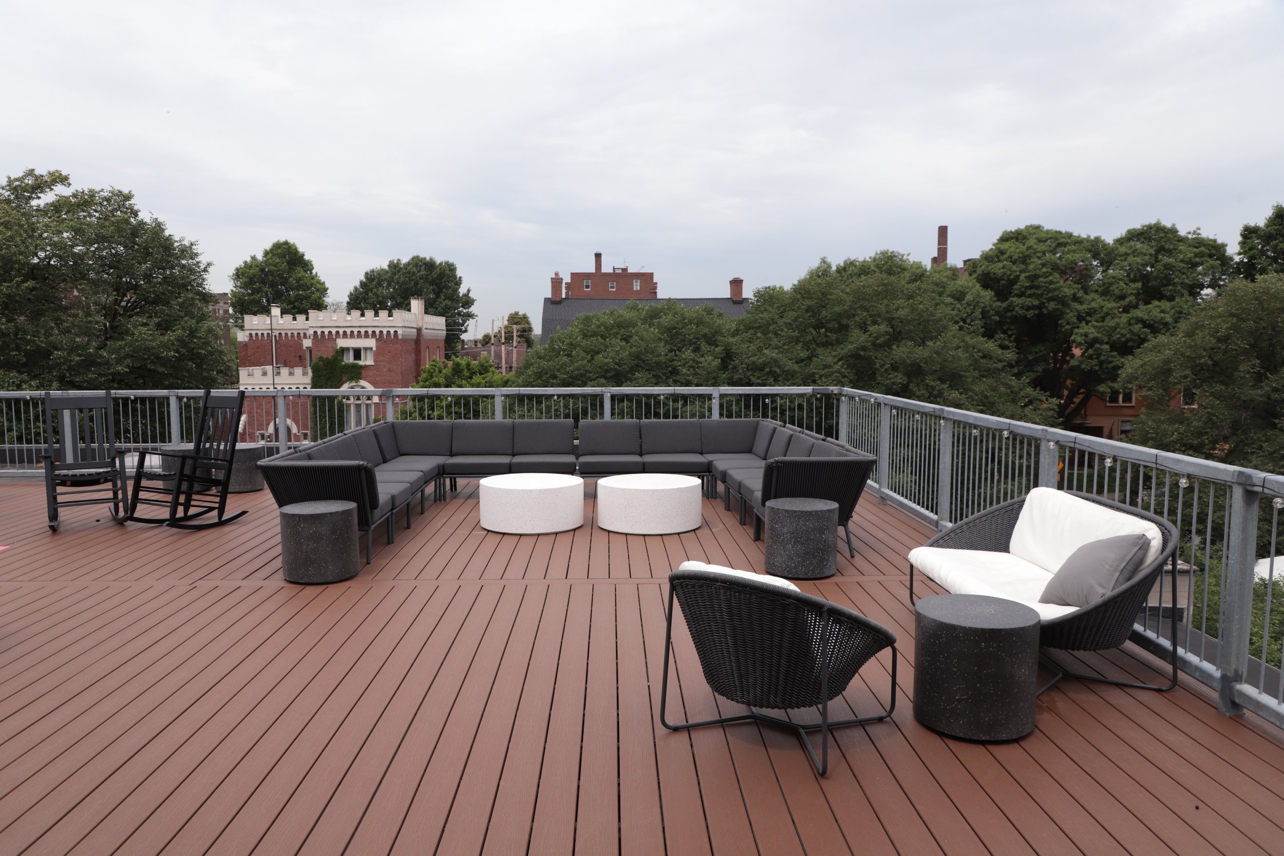 This open-air space includes grouped seating areas of modular, modern outdoor furniture. A small, adjacent indoor gallery is perfect for serving food and drinks for your outdoor cocktail hour. Use of this space must conclude by 9:00 p.m., and no amplified music may be played.