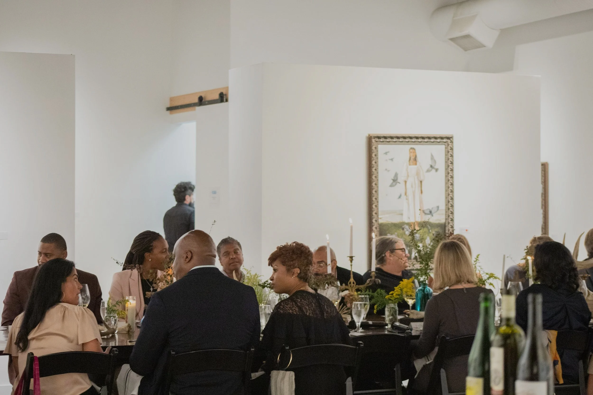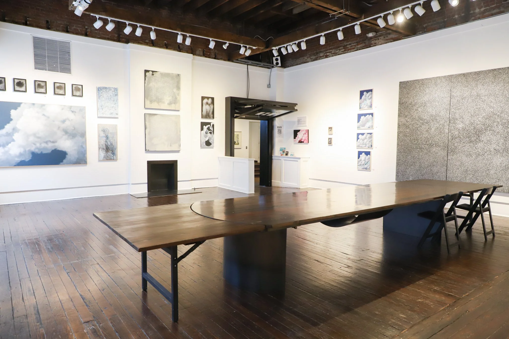 The Harrison Gallery features new art each month. It seats 80 auditorium-style or 60 at round tables. Unique features include a one-of-a-kind, handcrafted descending table made from historic ceiling beams, a full kitchen (rented separately), and a hydraulic, garage-style front door.