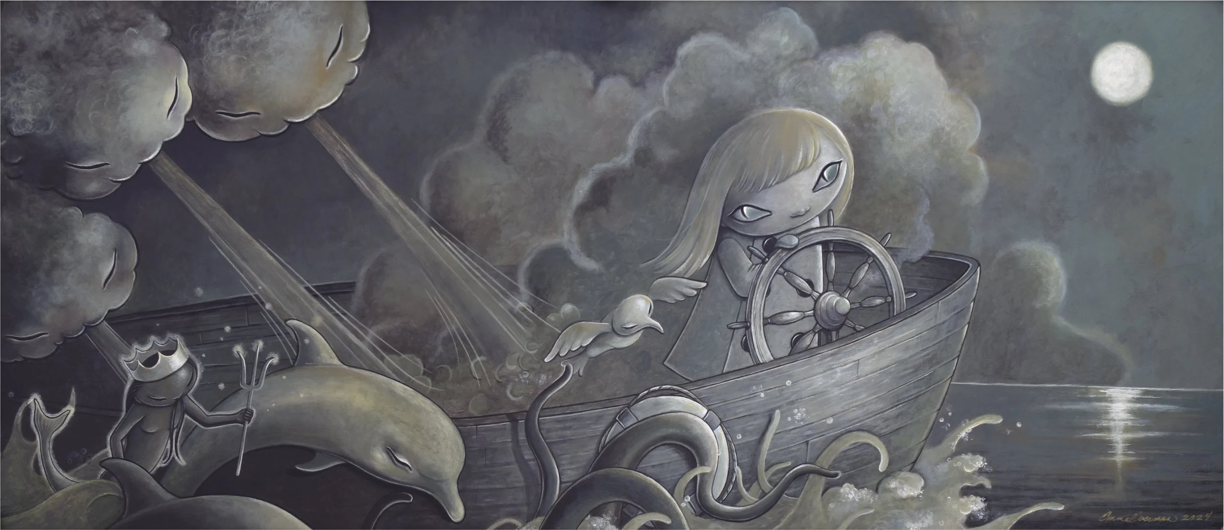 Voyages by Emma Overman. In her acrylic works, Overman views each painting as a journey, embarking with only a faint notion of destination yet embracing the unpredictable twists and turns that creativity brings. Her artistic endeavor is likened to a tree, with each idea branching into the next, symbolizing a continuous exploration through myriad directions.