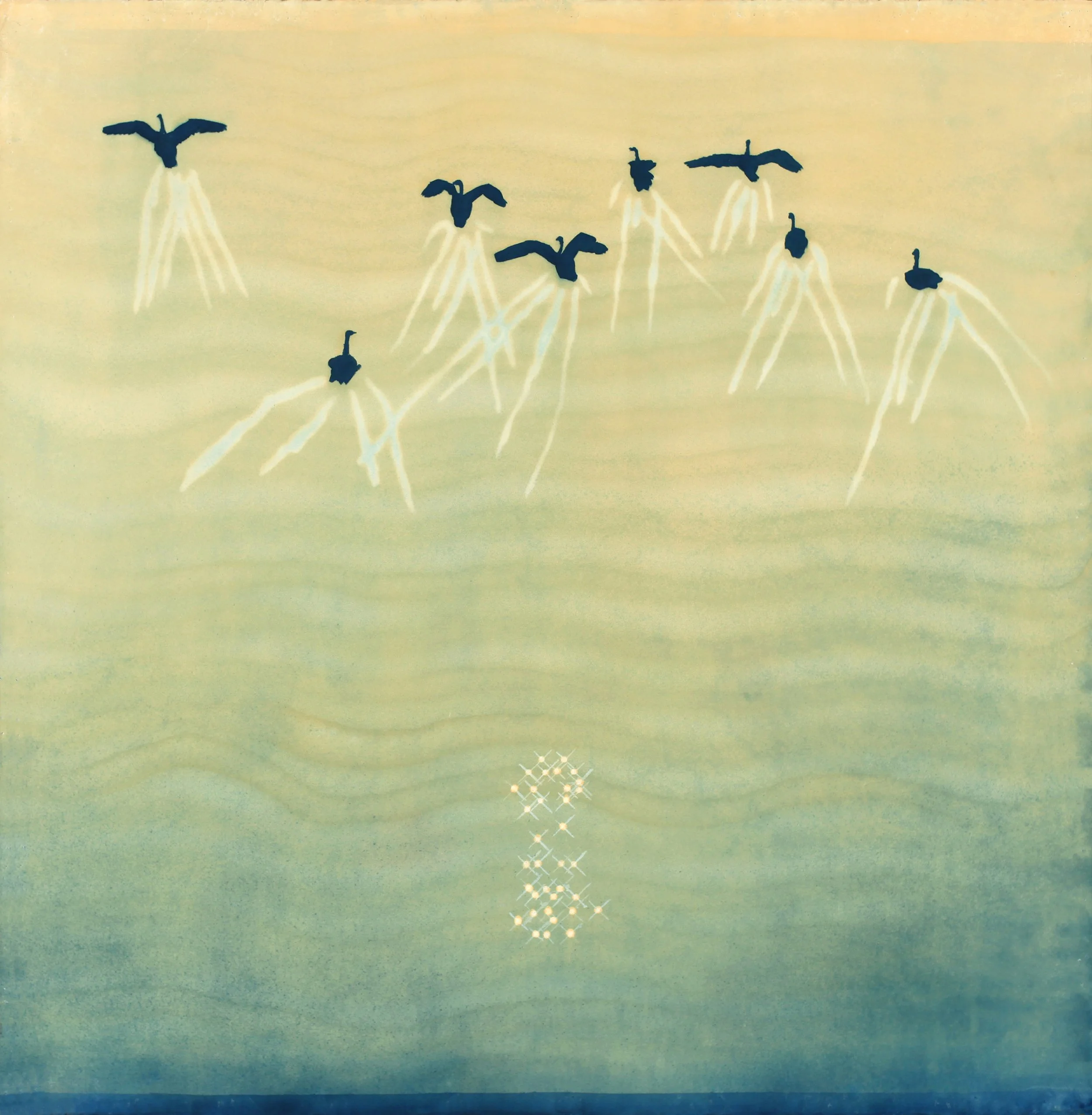 In the Sky Gallery, Listen by Elizabeth Guipe Hall. Inspired by recorded bird songs, Hall delves into different species, translating their calls into vibrant, textured artworks. Using layers of wax and collage, she transforms sound into color, providing a visual experience that bridges what we hear and what we see.