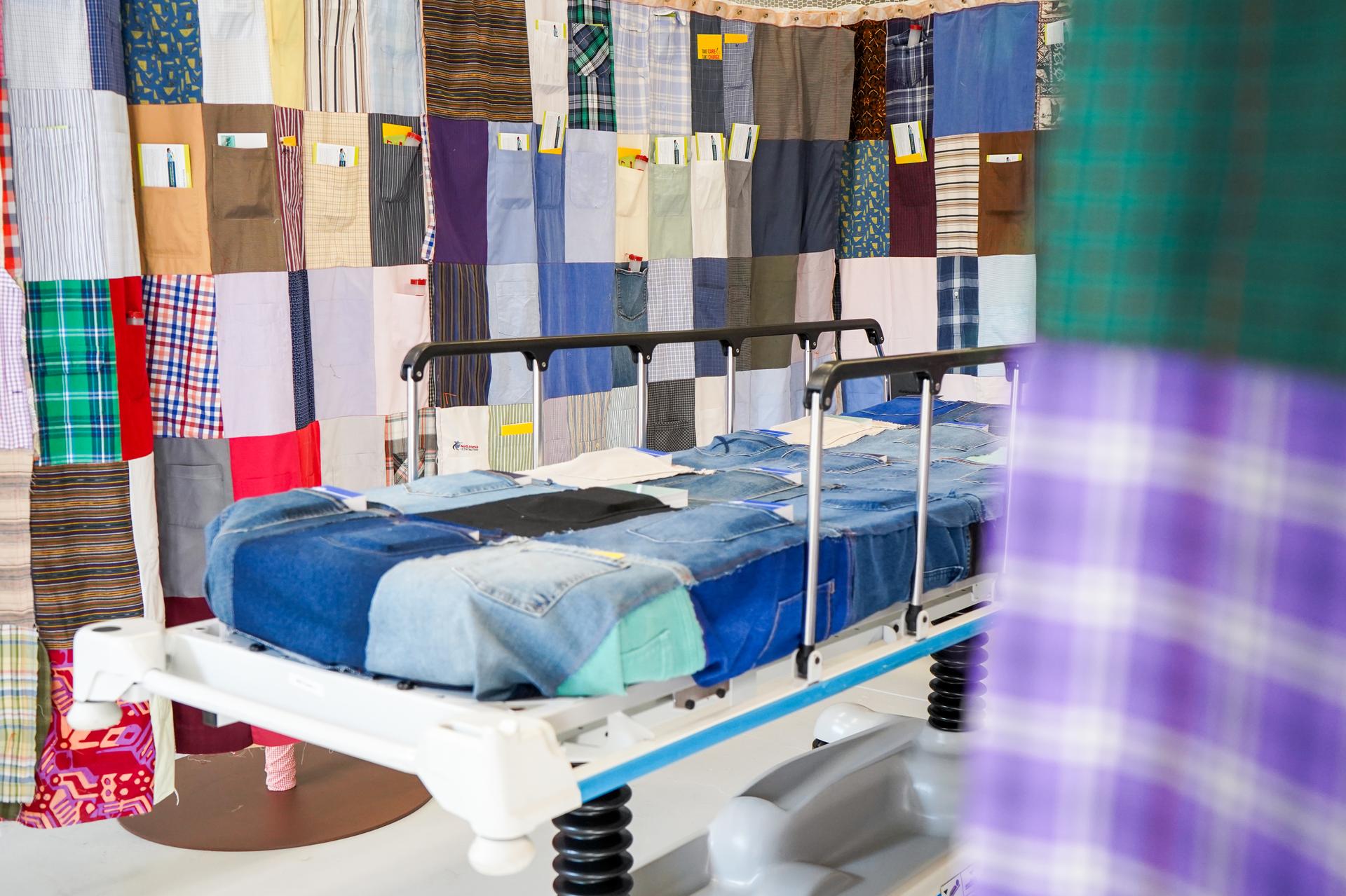 Walk into Phillip Campbell's Comfort and you'll find yourself in the last place you'd expect to feel safe: a hospital triage area. But this isn't the harsh fluorescent nightmare of actual emergency departments. Campbell has quilted the entire space – gurney, curtains, every surface – using clothing donated by people in recovery. The pockets that once held keys and loose change now hold Narcan, fentanyl test strips, and 12-step books.